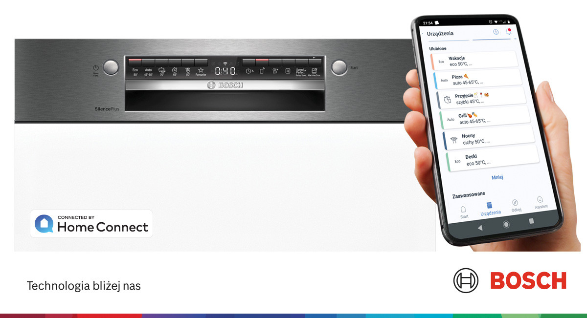 Home ConnectBezpłatna aplikacja Home Connect umożliwia zdalne monitorowanie urządzeń gospodarstwa domowego i sterowanie ich pracą z dowolnego miejsca. Ponadto oferuje stały dostęp do: cyfrowych instrukcji obsługi, sklepu internetowego, obsługi klienta i przydatnych wskazówek dotyczących użytkowania urządzenia; Zalety Home Connect: - możliwość pobierania nowych programów, dostępnych tylko w aplikacji - Asystent Programu zapewniający łatwą aktywację najbardziej optymalnego programu - zdalna diagnostyka - zdalna obsługa urządzenia - możliwość chwilowego wyciszenia w trakcie trwania programu